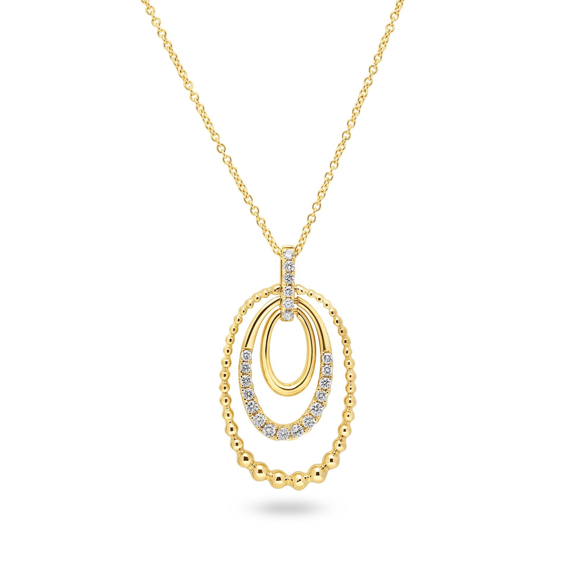 14ct yellow gold necklace featuring three concentric oval pendant with one graduating granule oval ring, one diamond set oval ring and one plain gold oval ring on a diamond set bail with a total diamond weight of 0.29ct