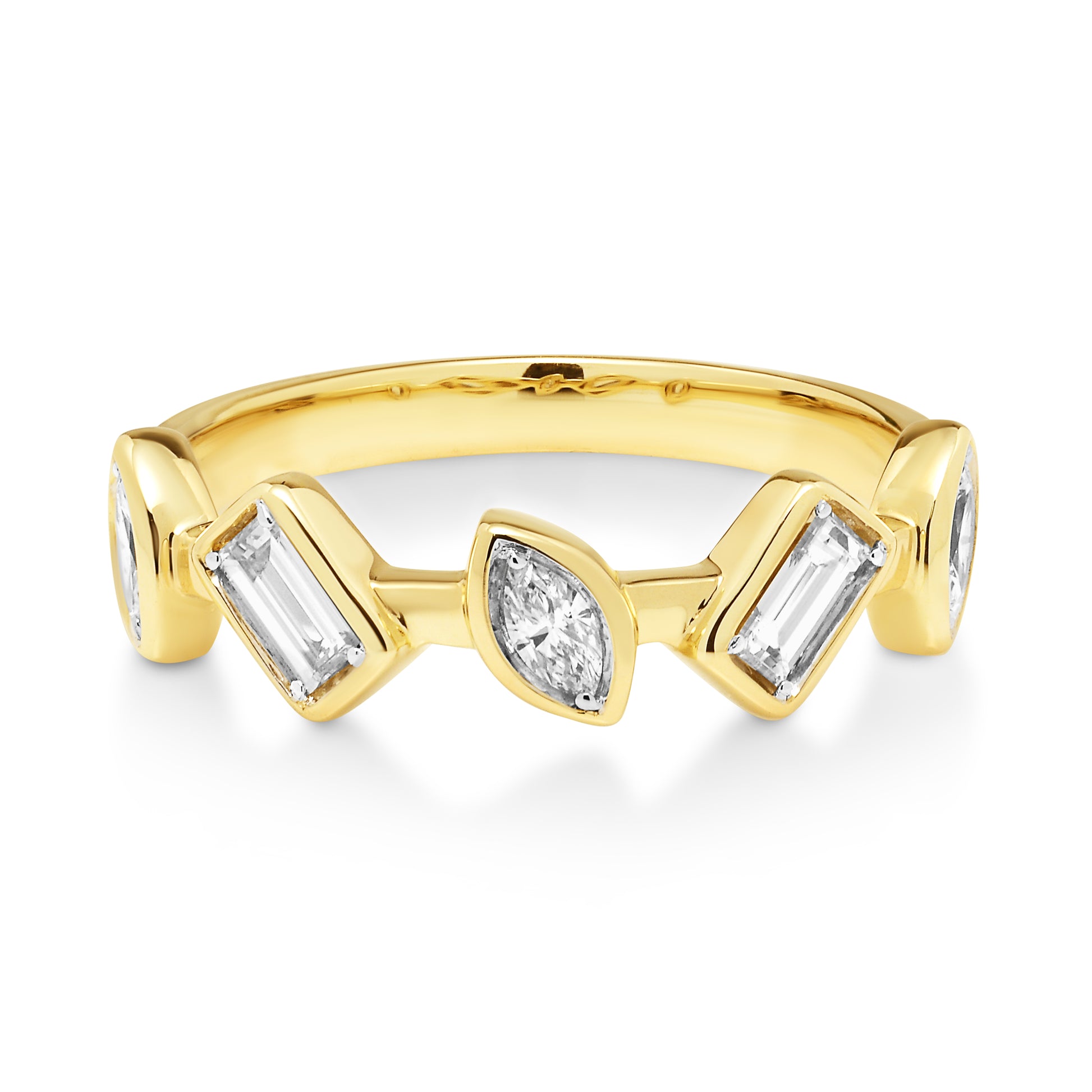 14ct yellow gold ring set with alternating marquise and baguette cut diamonds. There are three marquise cut diamonds with total weight of 0.194ct and two baguette cut diamonds with a total weight of 0.254ct.